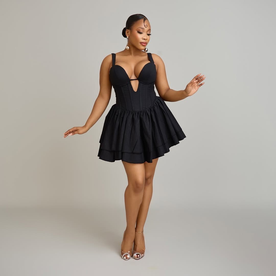Turn heads with our Black Corset Mini Dress, a perfect blend of elegance and allure. Featuring a structured corset bodice with a daring plunge neckline, this dress sculpts your silhouette while offering a confident, feminine fit. The flared layered mini skirt adds playful movement, making it ideal for nights out, cocktail events, or special occasions.